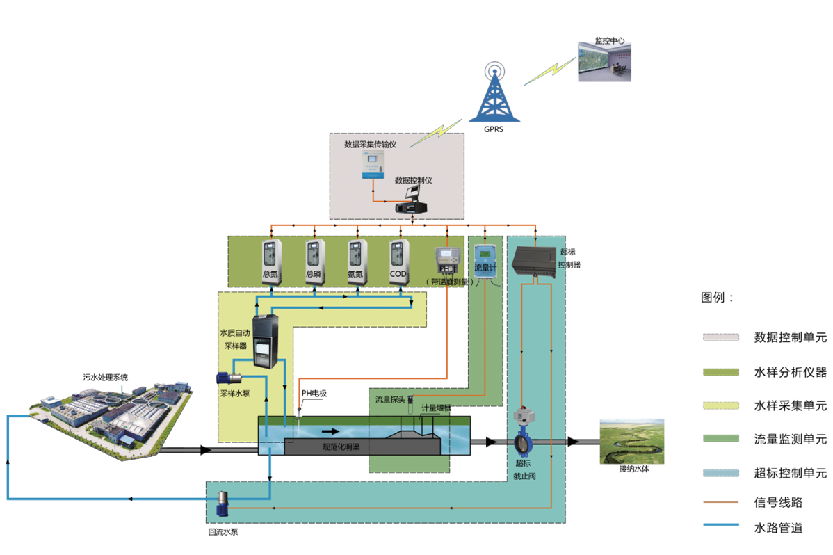 污染源水質(zhì)在線監(jiān)測系統(tǒng)適用于各排污企業(yè)對污染源水質(zhì)排污監(jiān)控及控制的需求。該系統(tǒng)根據(jù)2020年國家技術(shù)規(guī)范(HJ353-2019)和其他標(biāo)準(zhǔn)進行設(shè)計,由實現(xiàn)水污染源流量監(jiān)測、水污染源水樣采集、分析及分析數(shù)據(jù)統(tǒng)計與上傳等功能的軟硬件設(shè)施組成的系統(tǒng)。該系統(tǒng)具有監(jiān)測數(shù)據(jù)實時采集、傳輸、管理、質(zhì)控、反控等功能,還具有水質(zhì)治理設(shè)施運行情況分析功能和排污總量控制功能。